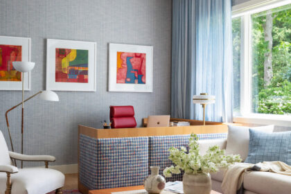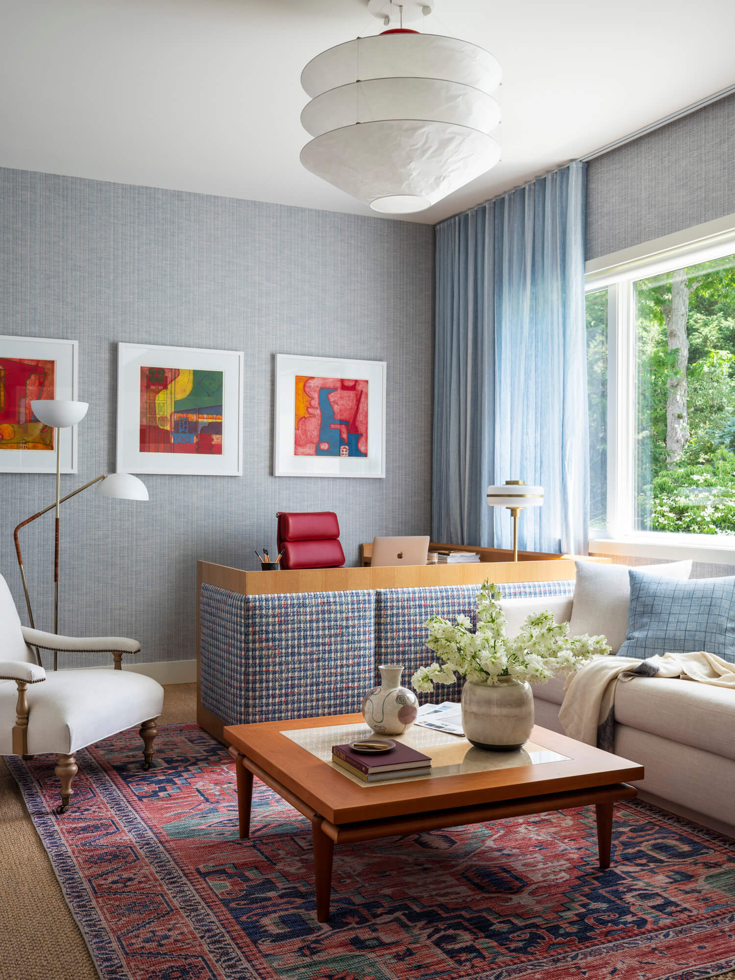 In the office, we added a thin, blue drapery that filters natural sunlight to bathe the room in a cool glow. While there are pops of color from the red chair, Persian rug, and wall-mounted artwork, the overall feeling of the room comes from the interplay of light and texture.