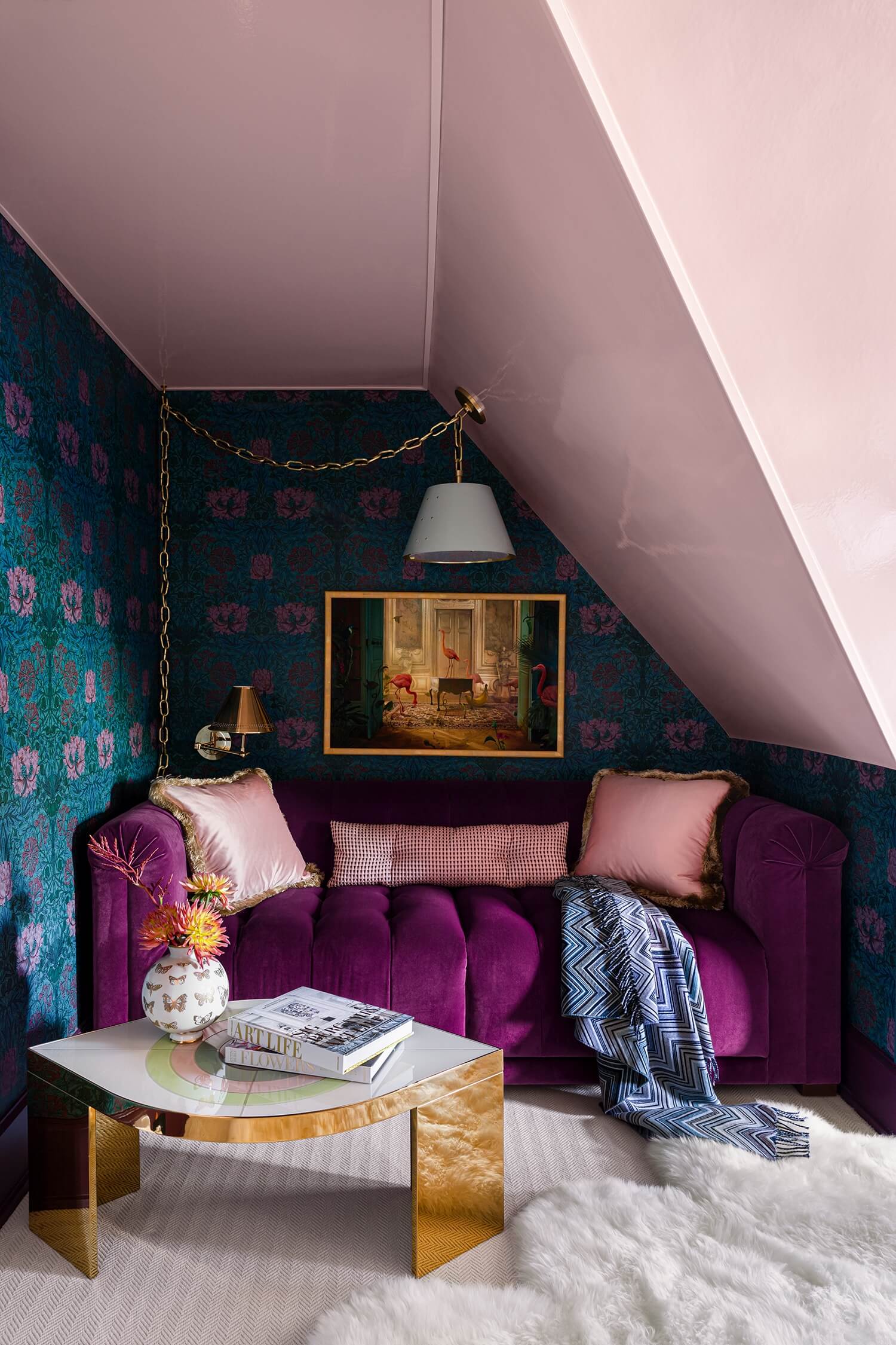 When planning the office design for this Bronxville home, we leaned into the attic ceiling’s dramatic, sloping lines that created a cozy charm. Since the only source of natural light is a small attic window, we chose a glossy, light pink paint for the ceiling that would bounce the sunlight through the space. A custom sofa nestles comfortably into a narrow wall space, making the perfect setup for a reading nook.