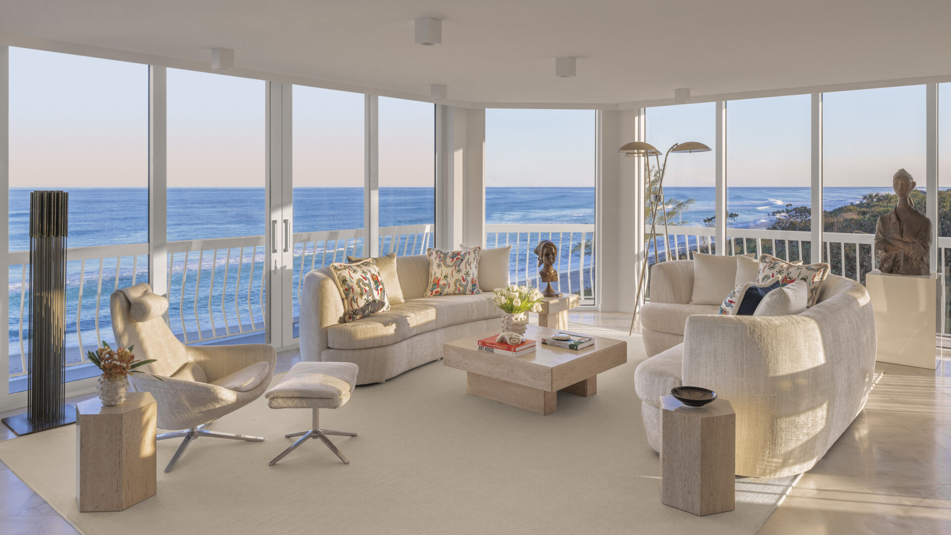 In contrast, the living room benefits from abundant natural light. Here, the layout was designed to welcome sunrise over the ocean while allowing sunlight to linger throughout the day. The result is a space that feels expansive and in constant dialogue with its surroundings.