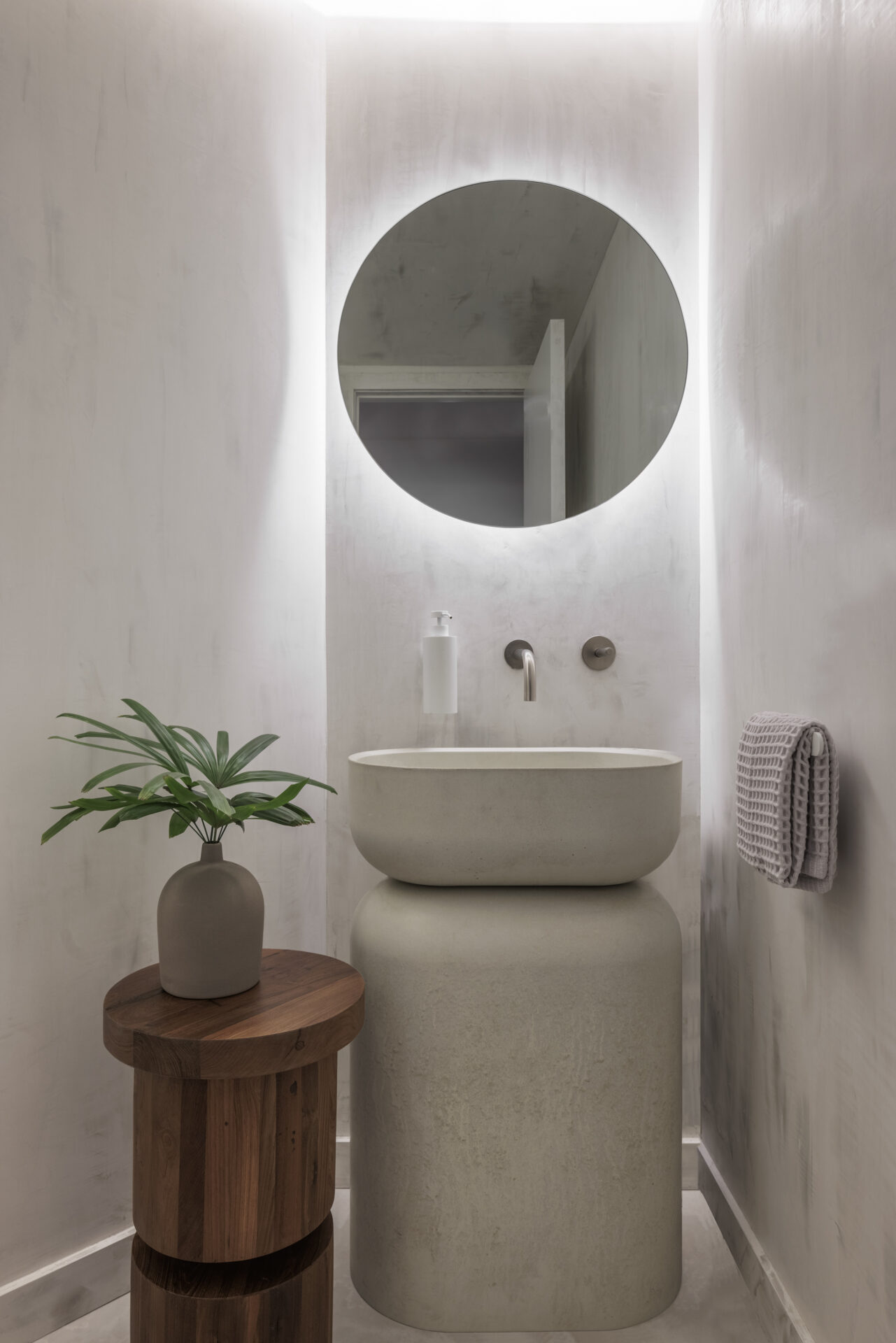 In our Sloan’s Curve Palm Beach condo, this philosophy comes to life in different ways. In areas without windows, like the powder room, we introduced a round mirror with integrated LED lighting to cast a soft, flattering glow.