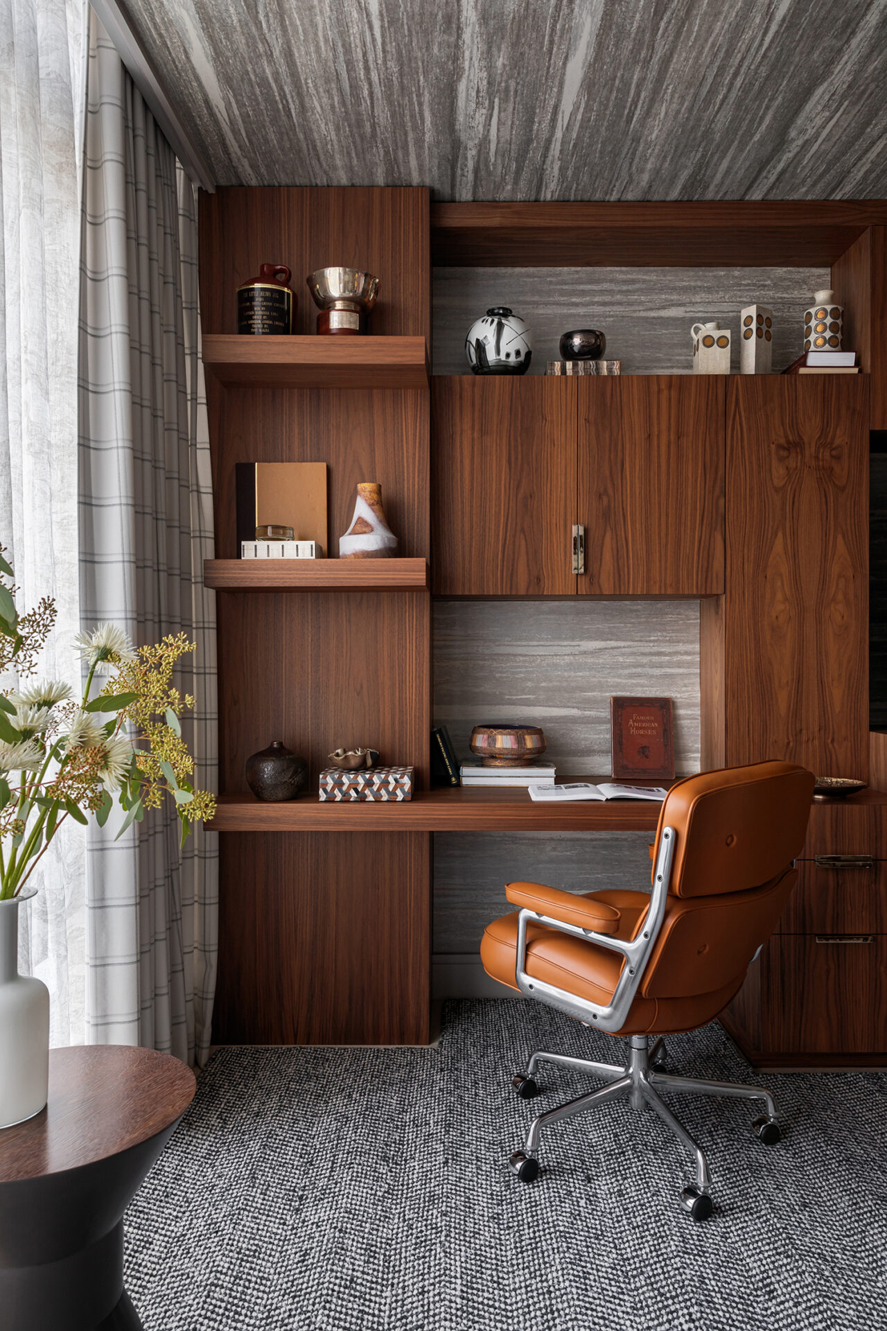 Contrast is one of my most trusted tools for defining zones and creating visual depth. In a compact home office, deep-toned wood built-ins ground the room, while a wallpapered ceiling introduces movement and lightness above. The striations in the wallcovering echo the natural grain of the wood, creating cohesion without visual clutter.