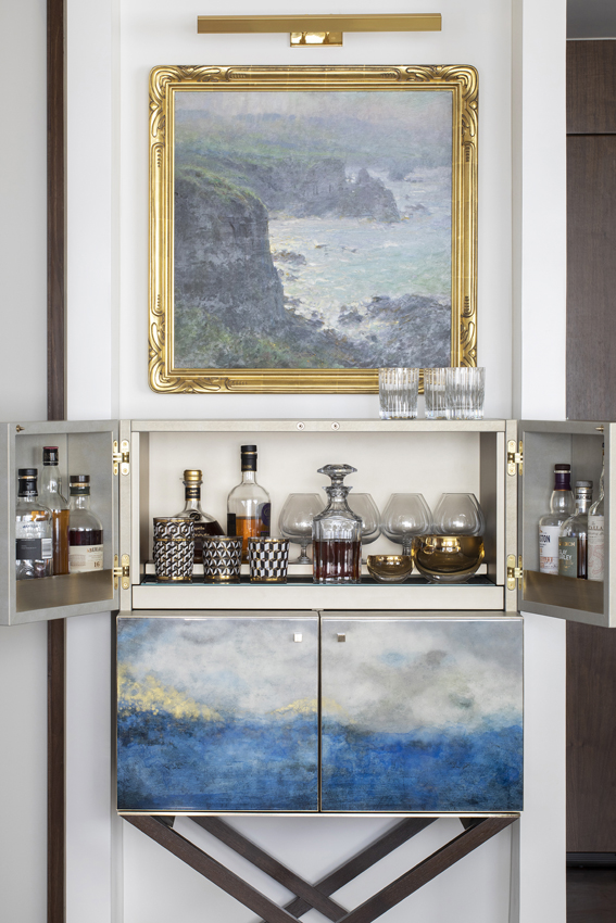 In the Lincoln Center Penthouse, our clients’ admiration for Giorgio Armani informed a carefully curated approach. Rather than filling the home with references, we placed select pieces strategically, including a custom-numbered brandy cabinet that stands as both functional object and sculptural art.